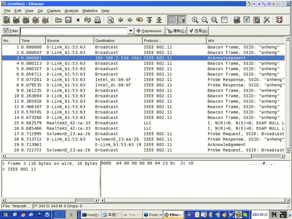 所以在使用Ethereal捕捉无线局域网的数据包时,选择正确的无线网卡工作模式就是非常关键的了。下图是安恒公司无线网分析工程师在linux系统上使用Ethereal捕捉和分析安恒公司实验用无线局域网时的抓图,点击可以放大。